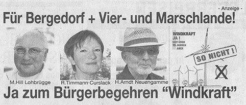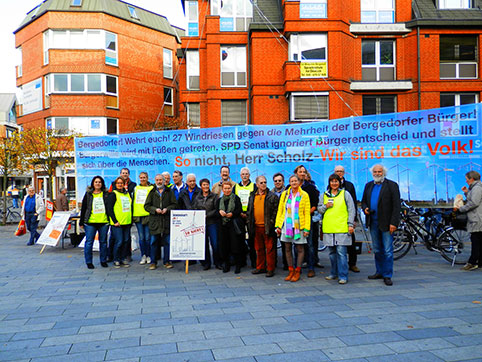 Großer Infostand auf dem Bahnhofsvorplatz in Bergedorf Die BI hatten in einem demokratischen Vorgehen einen gezielt auf den Bezirk Bergedorf ausgerichteten Bürgerentscheid mit einer überwältigenden zwei Drittel Mehrheit gewonnen. Der SPD-Senat hat den Bürgerwillen durch Änderung des Flächennutzungsplans mit Füßen getreten und will die Windriesen kompromisslos durchsetzen Willy Timmann, einer der Sprecher der BI: „Wir werden weiterhin die Öffentlichkeit über den Fortgang des Verfahrens informieren. Am Sonntag stehen wir Rede und Antwort.“ |