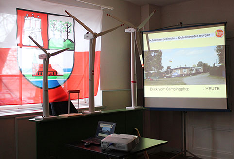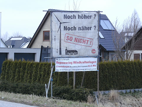 Aufstellen von Großplakaten in Ochsenwerder, Juni 2011 Im Juni 2011 stellten Mitglieder der BürgerInitiative Windkraft Ochsenwerder (BIWO) große Plakat von 2,4 x 2,2 m Fläche am Ochsenwerder Landscheideweg auf, um die Aufmerksamkeit der Vorbeifahrenden zu bekommen. Das Plakat zeigt den Größenvergleich der anvisierten Windenergieanlagen mit einer Nabenhöhe von 120 m mit der Kirchturmhöhe der Ochsenwerder St. Pankratius Kirche von 32 m. Die Gesamthöhe der Windenergieanlagen liegt bei rund 150 m. Der rote Schriftzug „So nicht“ verdeutlicht, dass die Bürgerinitiative in Ochsenwerder nicht grundsätzlich gegen den Bau von Windenergieanlagen ist (immerhin lebt man in Ochsenwerder seit 1997 mit sechs Anlagen), sondern sich gegen die Nähe der geplanten hohen Anlagen zur Wohn-bebauung richtet. Während in Hamburg ein Mindestabstand von nur 500 m zu Wohnhäusern eingehalten werden muss, ist dieser Mindestabstand in anderen Bundesländern 1000 m. Mittlerweile stehen vier solcher Großplakate verteilt in ganz Ochsenwerder. nach oben ![]() |