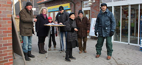 Für das Bürgerbegehren sind noch Unterschriften erforderlich. Deshalb wurden in Kooperation mit den anderen Bürgerinitiativen am Samstag den 26.01.2013 vor EDEKA Eggert in Fünfhausen, bei klirrender Kälte Unterschriften gesammelt. Auch am 27.01.2013 wurden Unterschriften gesammelt, diesmal im Umfeld eines Antik-Marktes im Zollenspieker Fährhaus. Beide Aktionen liefen für die Bügerinitiativen außerordentlich positiv. Rund 280 Unterschriften sind am Wochenende zusammen gekommen. Fast alle angesprochenen Personen haben unterschrieben. Überzeugungsarbeit war kaum nötig und auch "Auswärtige", die das Bürgerbegehren nicht unterschreiben durften, zeigten viel Verständnis für uns. |